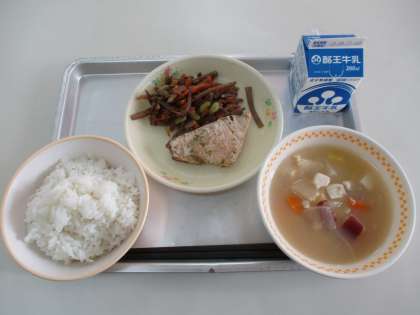 今日の給食は「和食献立」でした。メニューは、ご飯、牛乳、マスの三味焼き、五目きんぴら、さつまいも汁です。
