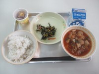 今日の献立は、きつねうどん、牛乳、大学かぼちゃ、おかかあえです。