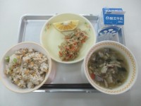 今日の献立は、麦ご飯、牛乳、鶏肉と豆のごまみそあえ、のりあえ、きのこ汁です。