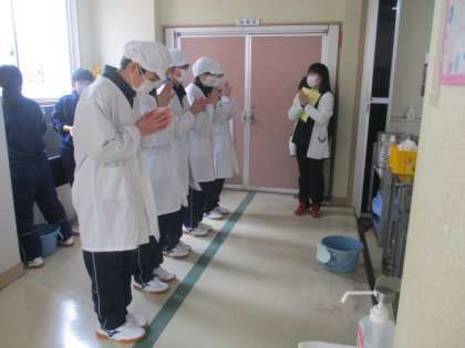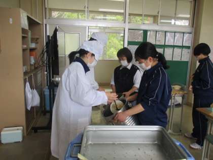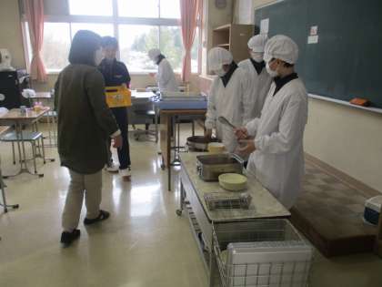 協力し合って配膳しています。先生方もサポートしています。