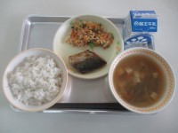 今日の給食は、麦ごはん、のっぺい汁、いわしのピリ辛ソースがけ、ひじき入りおひたし、牛乳でした。(739kcal)