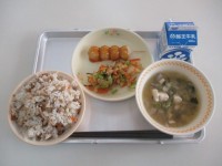 今日の給食は「節分の日献立」でした。メニューは、大豆と昆布の味ごはん、牛乳、いわしの生姜煮、三色おひたし、南蛮汁、黒糖福豆です。今年は地球が太陽の周りをまわる時間の関係で2月2日が「節分」でした。みなさん豆まきはしましたか?今日もおいしい給食ごちそうさまでした。