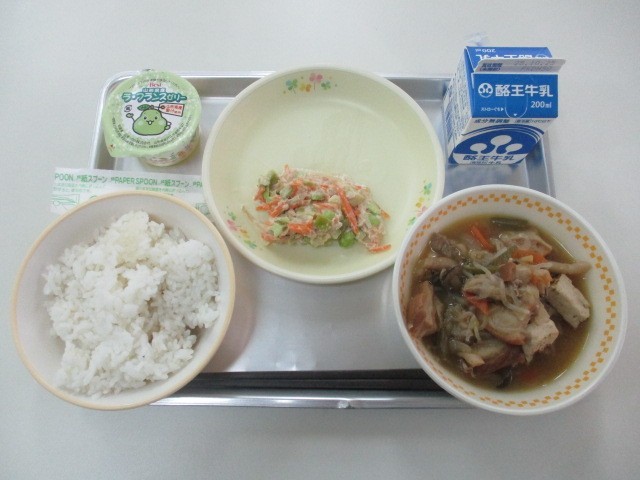 今日の給食は、麦ごはん、牛乳、肉豆腐、みそマヨネーズあえ、ラ・フランスゼリーでし...
