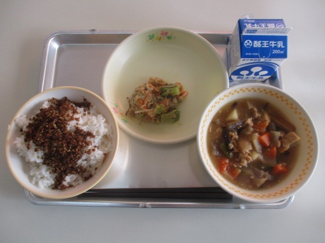 今日の献立は、麦ごはん、手作りおかかふりかけ、牛乳、大根と生揚げのそぼろ煮、中華...