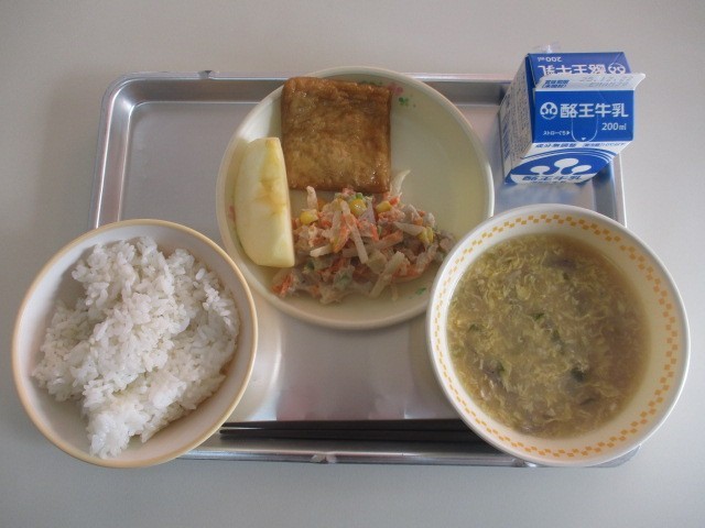今日の給食の献立は、麦ごはん、牛乳、肉詰めいなり、みそマヨネーズあえ、玉ねぎと卵...