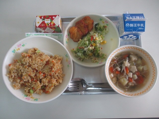 今日は「お楽しみ献立」です。メニューは、スパイシーピラフ、牛乳、チキンナゲット、...