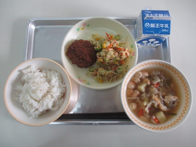 今日の給食は、麦ごはん、牛乳、ハンバーグの和風ソースかけ、スパゲッティサラダ、大...