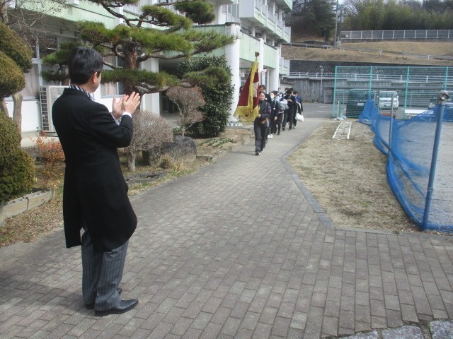 厳かな式の後は、生徒会長の先導によるお見送りです。在校生と教職員の温かい拍手の中...