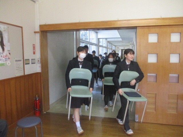 修了式に向けて、生徒たちが会場の多目的室へ入場する様子です。式では、1年生・2年...