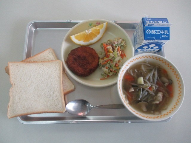 今日は「旬を食べよう(ジューシーフルーツ)!献立」です。メニューは、食パン、牛乳...