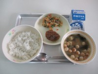今日の献立は、そぼろごはん、牛乳、おかかマヨ和え、小松菜と生揚げのみそ汁、ミニチ...