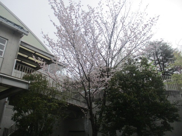 校舎北側ではまだ桜が楽しめます。用務員さんが大切に育てている花壇の花々もきれいに...