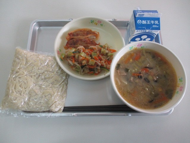 今日の献立は、みそラーメン、牛乳、ぎょうざ、キムチ和えです。給食の放送では、ぎょ...