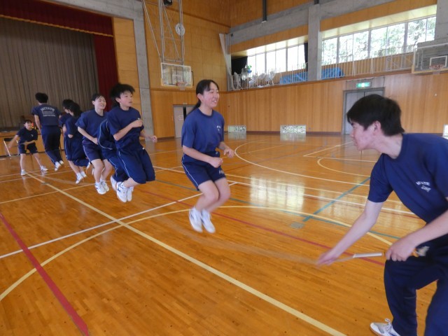 保健体育の授業では、1年生と3年生が合同で縄跳びに挑戦しました。3年生が手本を見...