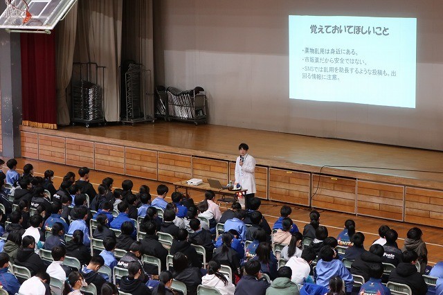 講話では、麻薬やオーバードーズなど薬物がもたらす健康被害だけでなく、酒、たばこなど依存の怖さや、将来の進学・就職にも影響する社会的なリスクについても学びました。また、SNSを通じた“甘い誘い”の危険性や、「一度だけなら大丈夫」といった誤った情報に惑わされない判断力の重要性についても強調され、生徒たちは真剣な表情で耳を傾けていました。