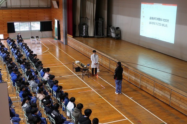 本日、2学年生徒を対象に「薬物乱用防止教室」を実施しました。講師の先生から、薬物の種類や心身への影響、誘いから身を守る方法などについて、具体的な例を交えながら分かりやすくお話しいただきました。