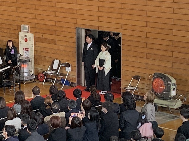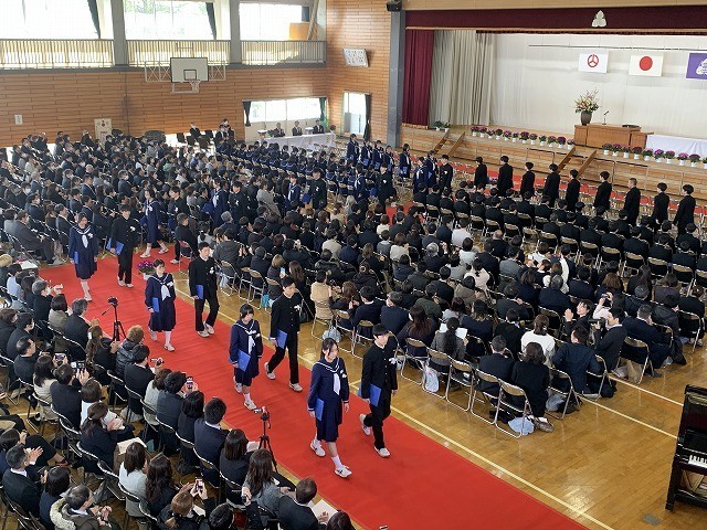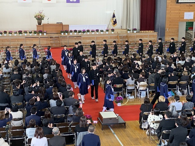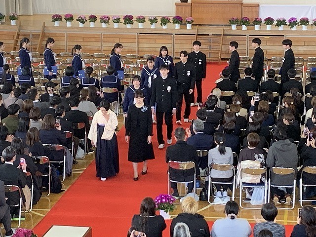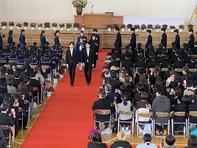 保護者の皆さまや教職員、在校生が見守る中、卒業生が担任の先導で堂々と入場しました。少し緊張した面持ちの中にも、3年間の成長を感じさせる立派な姿が印象的でした。