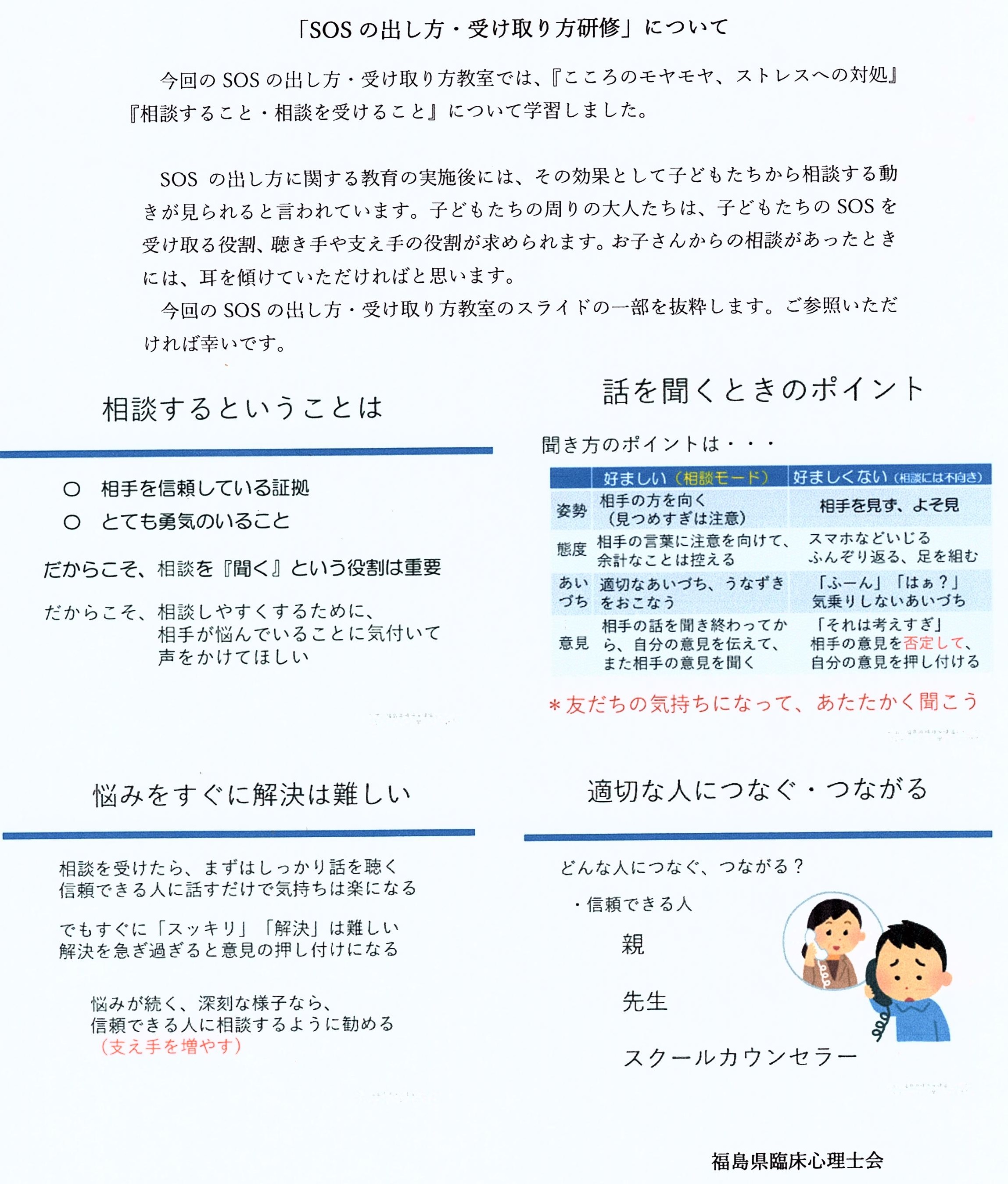 3学年を対象に「SOSの出し方・受け取り方に関する教室」が開かれました。臨床心理士の中田先生からは、悩みについての考え方や相談の方法、体を動かしたリラックス法など、受験期の3年生にとって大変有意義なお話をしていただきました。