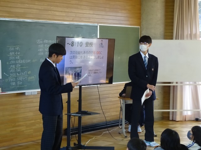 校長先生の挨拶の後、中学校生活について生徒会役員と生徒指導主事から説明がありました。