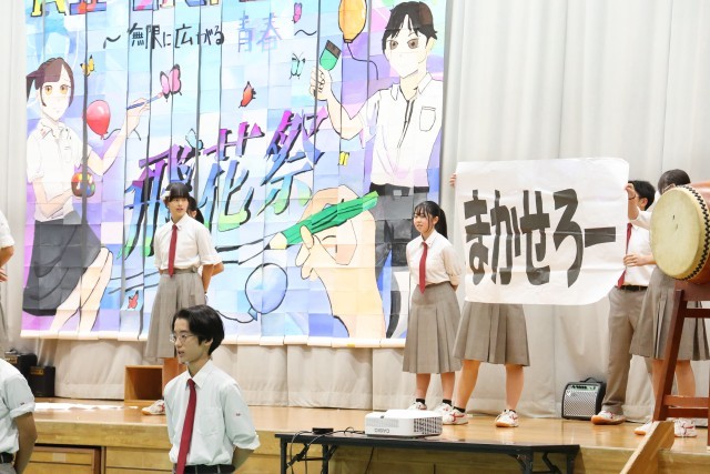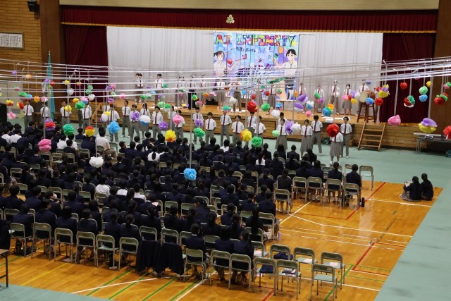 吹奏楽部は4月から練習してきた「鳥之石楠船紙神」の演奏。そして今話題の曲をメドレーで演奏してくれました。最後は「ジャンボリミッキー」を生徒全員で踊り、午前の部一番の盛り上がりになりました。