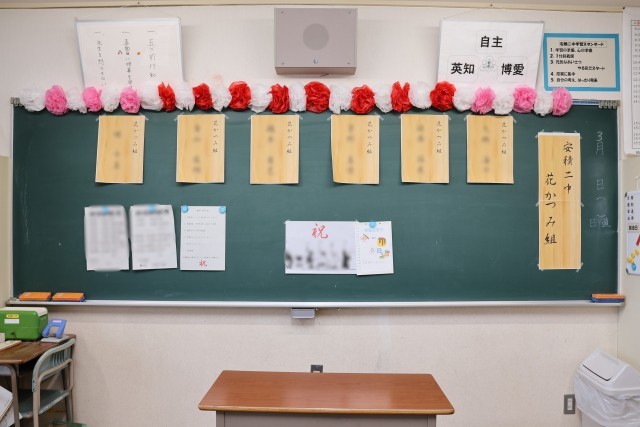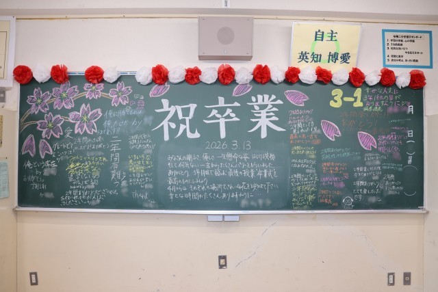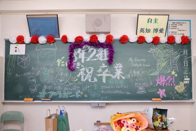 卒業生が教室をあとにした後、教室の黒板には担任からのメッセージや、仲間との思い出が書き込まれていました。