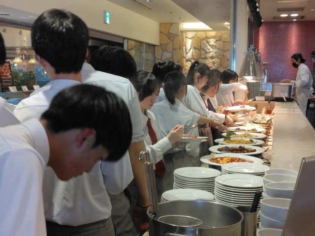 生徒たちはそれぞれ食べたい料理を選びながら、班で会話を楽しみつつ、落ち着いて食事をとっていました。