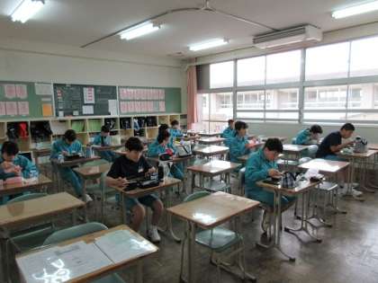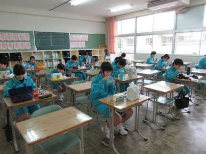 お昼の時間には、皆静かにお弁当を食べています。友達同士でおしゃべりはできませんが、美味しそうに味わって食べています。保護者の皆様には、毎回愛情を込めてお弁当を作っていただき、本当にありがとうございました。休校中には、自宅で自分で料理をした生徒もおり、改めて家族に対する感謝の気持ちをもってお弁当を味わった生徒も多いと思います。