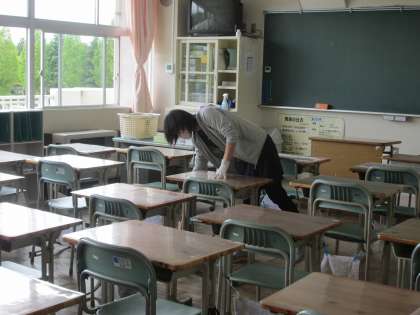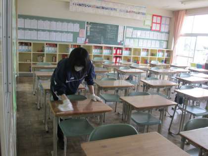 分散登校最終日。学校再開に向けて、消毒作業を行いました。来週から、学校が再開されます。皆さん元気に登校してください。課題を忘れずにやりましょう。
