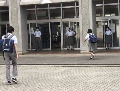遅刻者は0。リズムある生活に時間を守ることは欠かせません。生徒会役員、中央委員の生徒が、朝のあいさつ運動を行っています。
