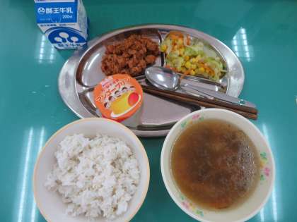 今日の給食は、タコライス、タコライス用サラダ、沖縄風もずくスープ、マンゴープリンでした。