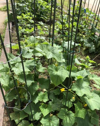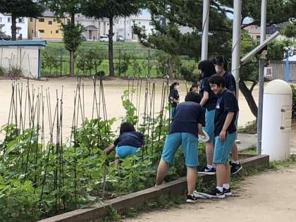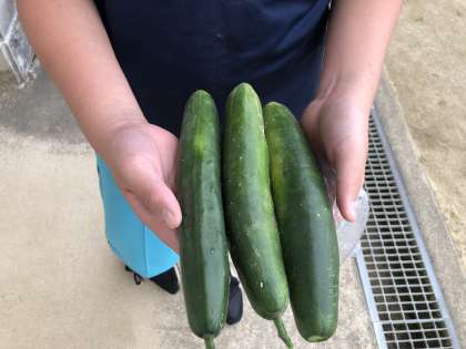 2年生の技術では、栽培の単元でキュウリ、オクラ、枝豆を作っています。今年は例年よりもはやく立派なキュウリを収穫しました。大切に育てた野菜なので、おいしいでしょうね。