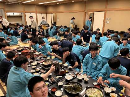 1日目の日程を無事に終えました。全員元気に宿に到着しました。宿は三条大橋のすぐ近くの宿です。夕食はスキヤキです。とても、美味しいお肉でした。