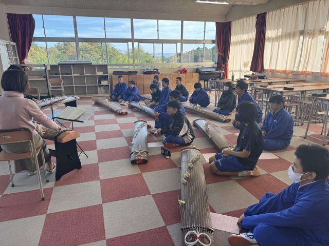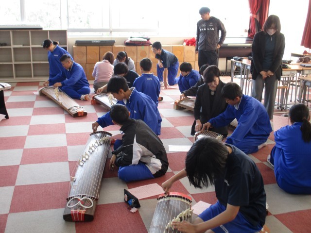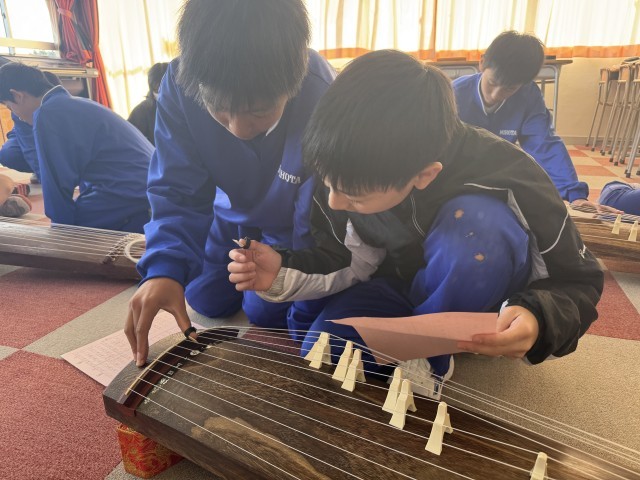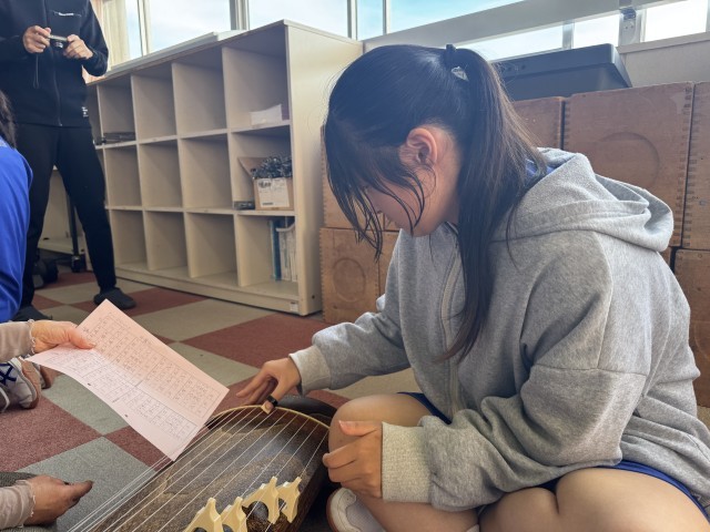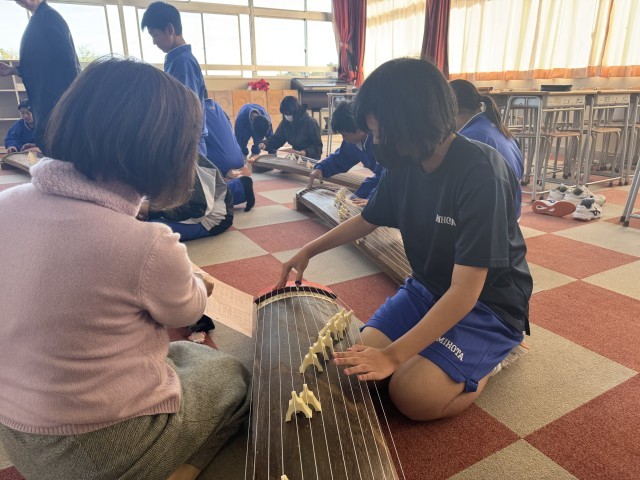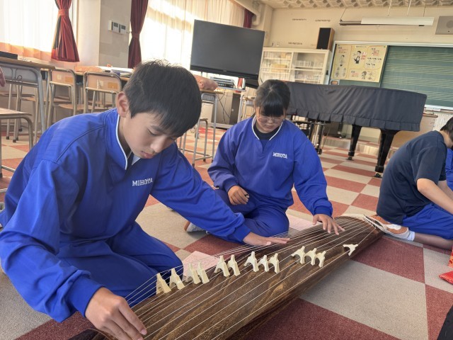 11月5日、音楽の授業で和楽器講習会を行い、講師の先生に箏の演奏を教えていただきました。先生の演奏に感心しながら、自分たちも挑戦! はじめはむずかしかったけれど、少しずつきれいな音が出せるようになり、日本の伝統音楽にふれ、とても楽しい時間になりました。