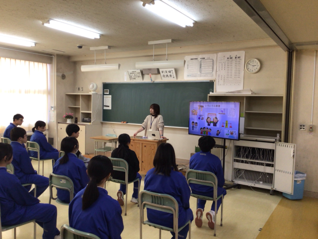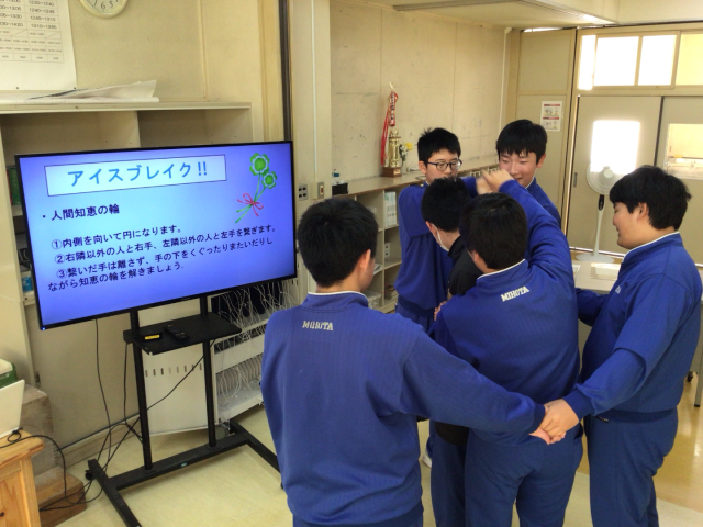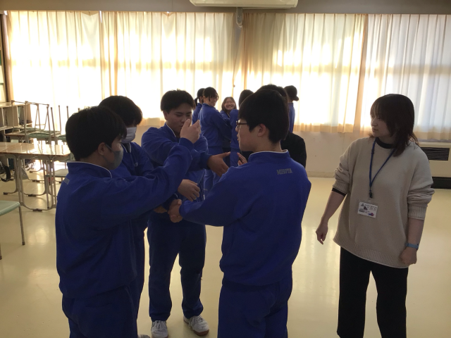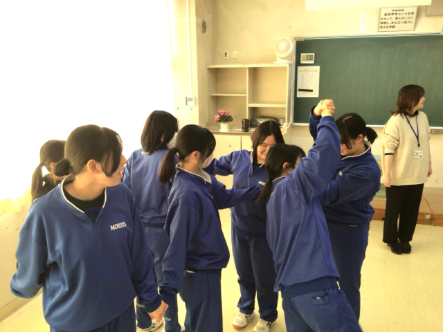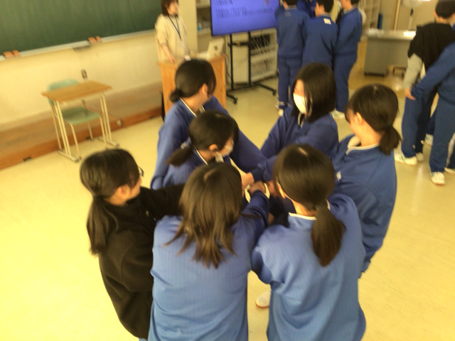 本校スクールカウンセラーが中学3年生に向けてストレス解消講座を行い、笑顔で過ごすことの効果や筋弛緩法を学びました。また、人間知恵の輪にも取り組み、楽しみながら心身をリラックスさせる時間となりました。