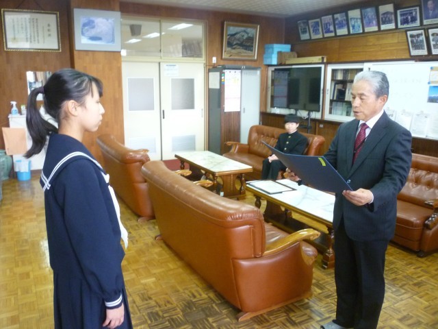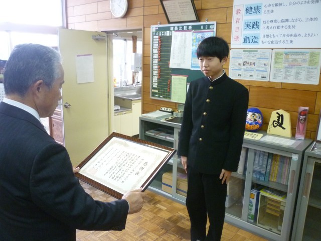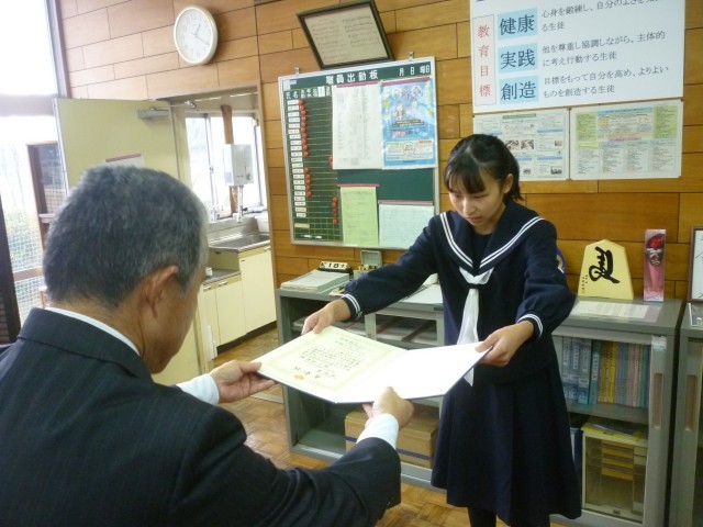 本日、福島県人権擁護作文コンテストで入賞した生徒に賞状が授与されました。また、学校の人権思想普及活動に対して「感謝状」が贈られ、代表生徒が受け取りました。