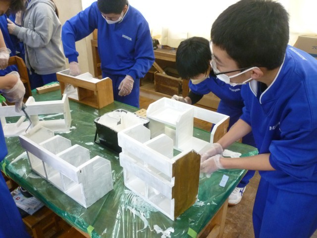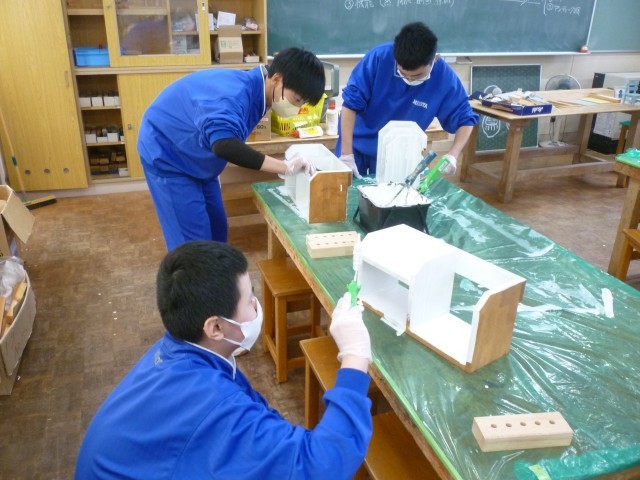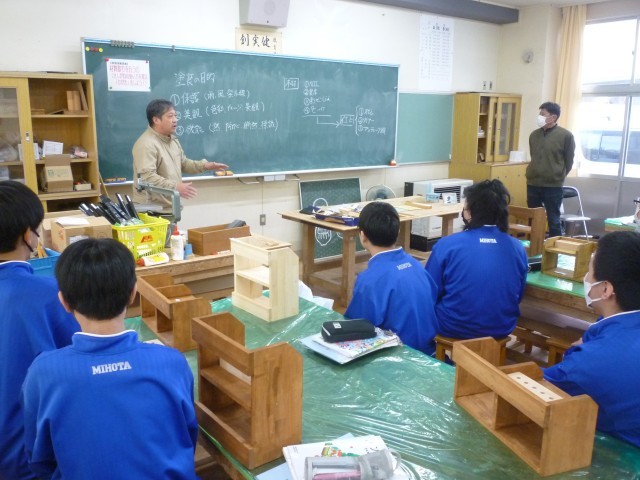 木材加工の実技指導(第3回目)を行いました。今回は塗装と加工を行い、いよいよ作品が完成近づきました。生徒たちは自分の好みに合わせて塗料を選び、仕上がりをイメージしながら丁寧に作業に取り組んでいました。プロの技術に触れ、講師の先生のサポートを受けながら、ものづくりの楽しさを実感する貴重な時間となりました。