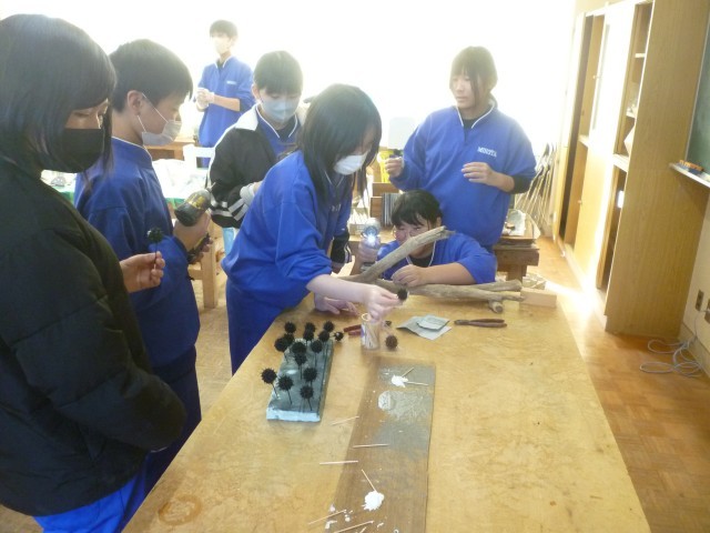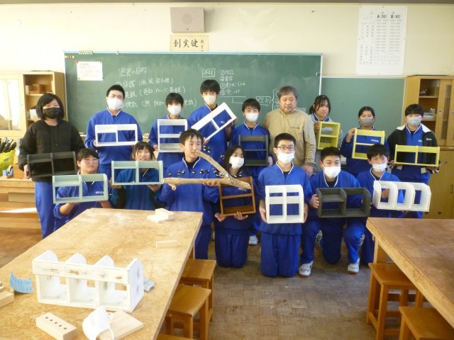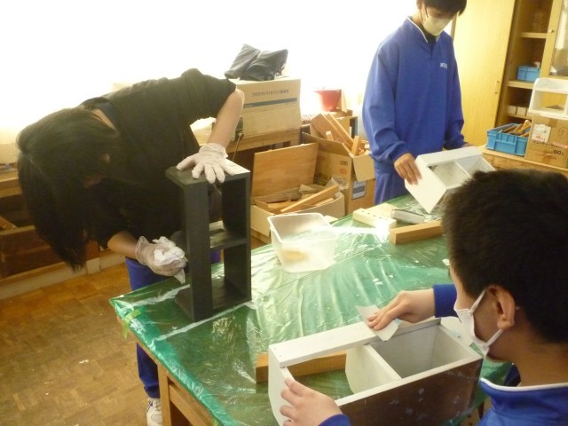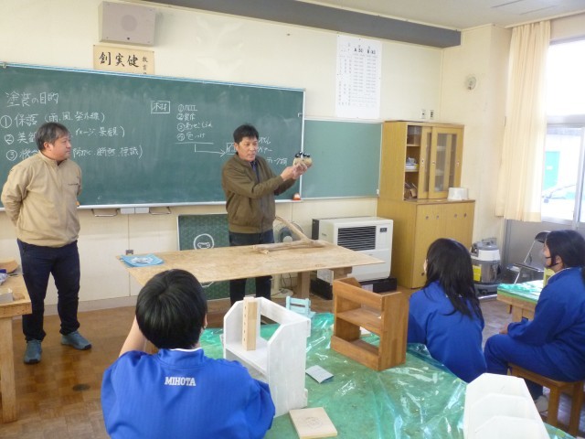 木材加工の実技指導最終日を行いました。今回は塗装の仕上げに取り組み、生徒たちはそれぞれ工夫しながら作品を完成させました。また、廃材を活用した学級オブジェの制作も行い、ものづくりの楽しさを実感する時間となりました。最後に講師の先生から、「ものづくりの楽しさを実感し、興味を持った人は今後もぜひ挑戦してほしい」との言葉があり、生徒たちにとって心に残る学びの時間となりました。