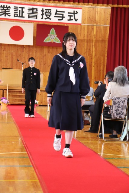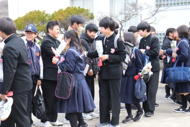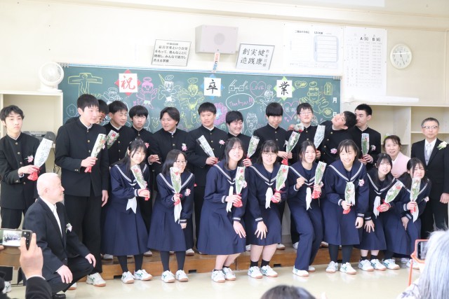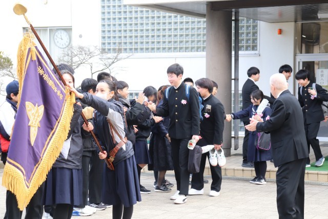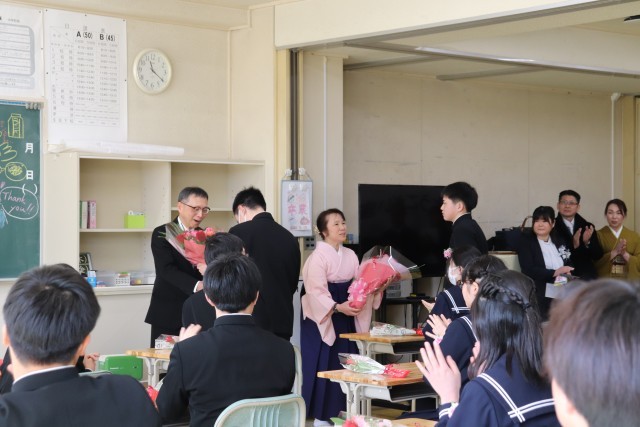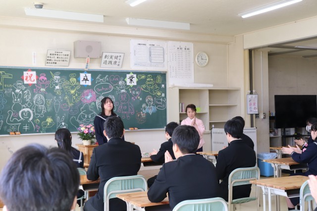 式の後には、教室で最後の学級活動が行われました。担任の先生からのメッセージや仲間との思い出を振り返りながら、笑顔と涙があふれる温かな時間となりました。最後は在校生や職員に見送られながら、卒業生は学び舎を後にし、それぞれの新しい道へと巣立っていきました。