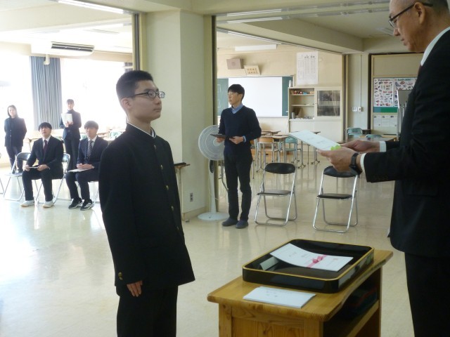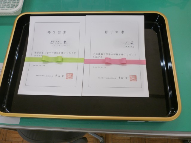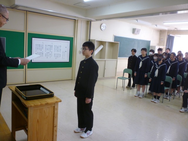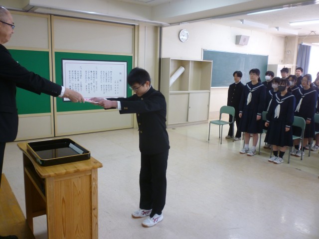 本日、令和7年度の修了式が行われました。式では、学校長より各学年の代表生徒に修了証書が手渡され、1年間の学びの成果を改めて実感する節目の時間となりました。校長式辞では、「夢をもつことの大切さ」について触れられ、「この年度末・年度初めの休業日を、新年度に向けた夢を描く大切な時間にしてほしい」との力強いメッセージが送られました。生徒たちは真剣な表情で耳を傾け、それぞれの心に新たな目標を刻んでいる様子がうかがえました。4月から新しい学年が始まります。生徒一人ひとりが希望と意欲を胸に、それぞれの夢に向かって力強く歩み出してくれることを願っています。