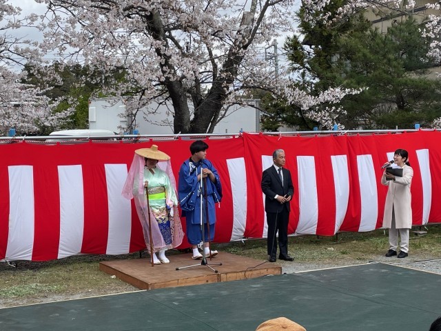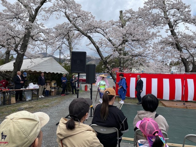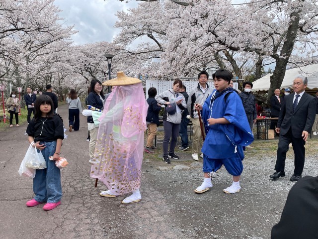 開会行事の後、義経伝説の1つでもある「静御前道中」の再現が行われ、本校生徒が静御前に扮し、すばらしい桜並木を優雅に歩く姿が多くの参加者を魅了しました。