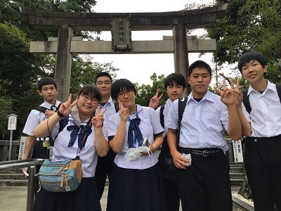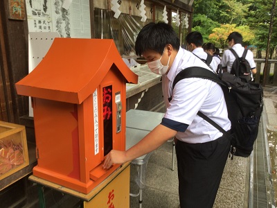 記念撮影しました。お土産を買った人もいるようです。おみくじは何を引いたのでしょう。