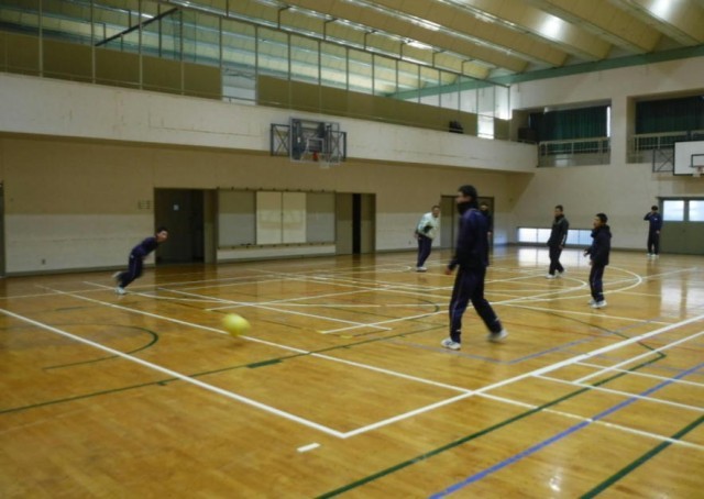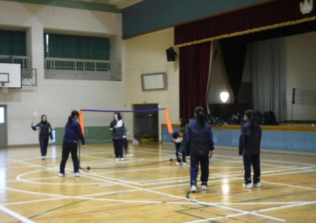 今日は寒い朝でした。朝の運動のようすです。男子はドッチボール、女子はバドミントンをして体を動かしていました。