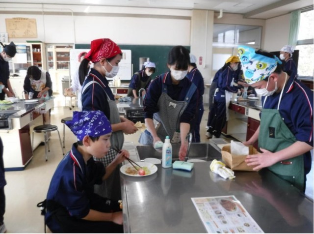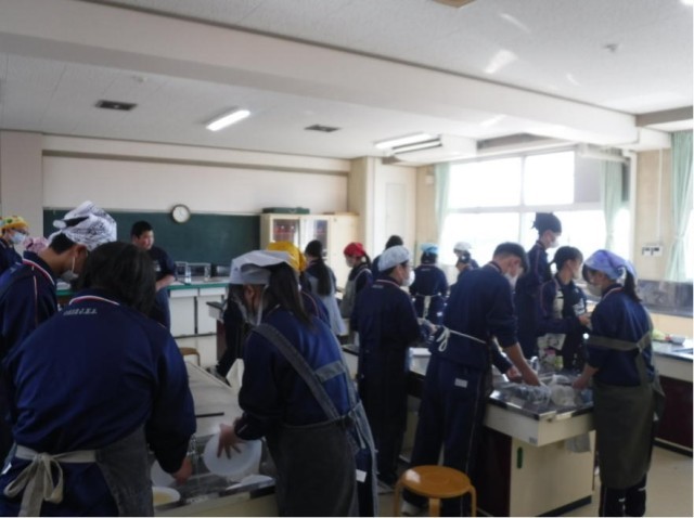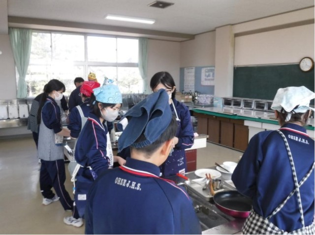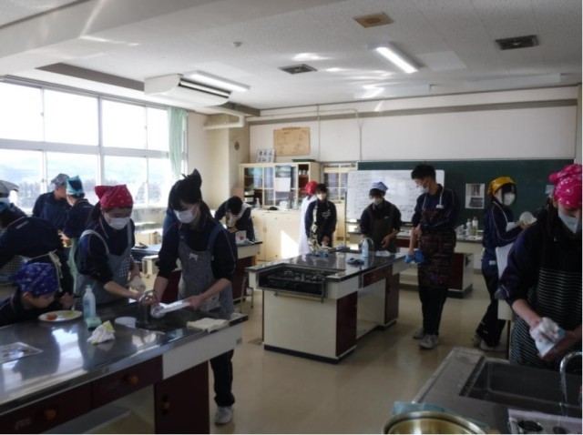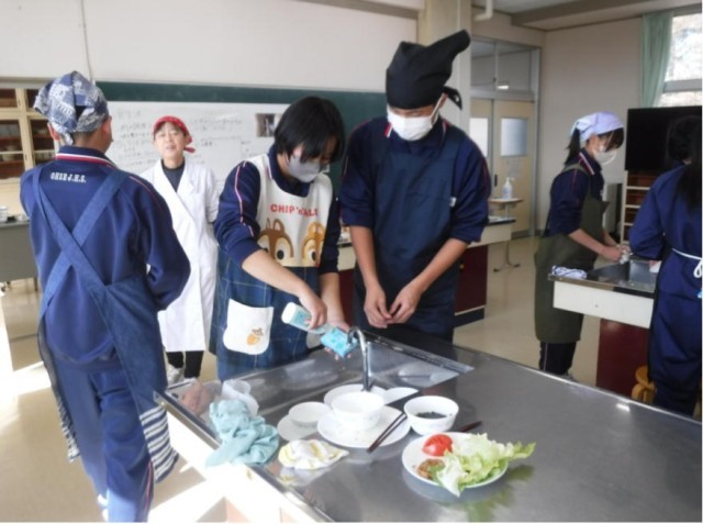 1年生の家庭科で調理実習を行いました。生姜焼きにサラダの盛り付けとわかめスープを作りました。授業を見に行ったときには、食べ終わって後片付けをしていました。とても手際が良く感心しました。どの生徒も「おいしくできた」という感想でした。