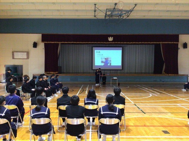 3年生が中心となり、わかりやすく逢瀬中学校の生活を説明しました。