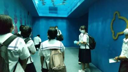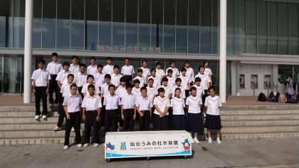 2年生は、うみの杜水族館前で記念撮影をパチリ。いよいよ見学、楽しみです。