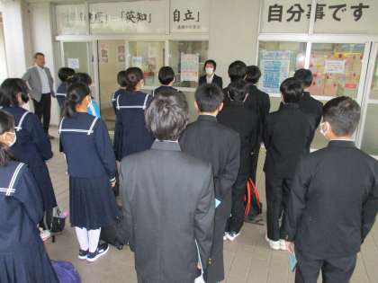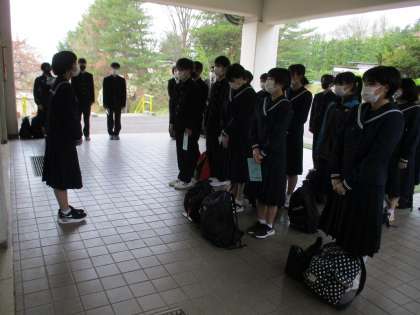 今日からいよいよ修学旅行です!3年生は全員、元気に出発式を行いました。