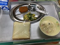 食パン、ホワイトシチュー、焼きコロッケ、春色サラダ、牛乳です。