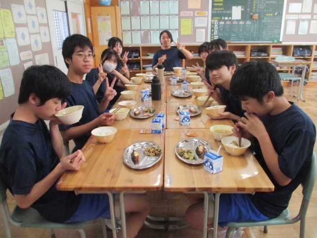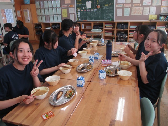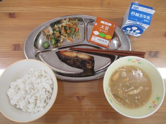 本日は、「食育の日献立」の日です。メニューは、麦ごはん、ミナミカゴカマスの西京焼き、梅昆布和え、すいとん、大豆ふりかけでした。