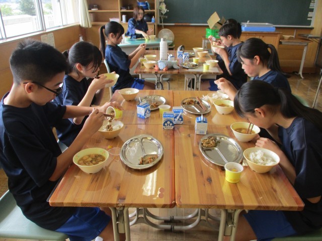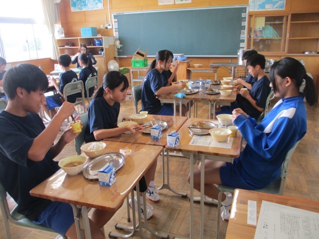 本日は、「旬の味覚献立~なす~」の日です。メニューは、麦ごはん、納豆、秋なすと豚肉の味噌炒め、いも団子汁でした。