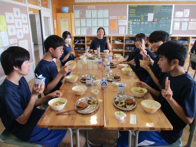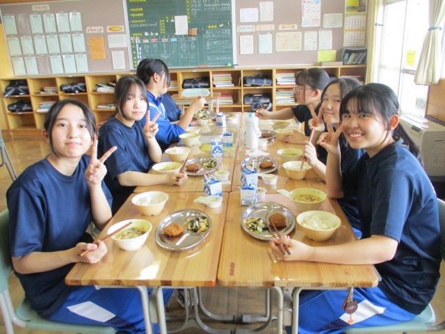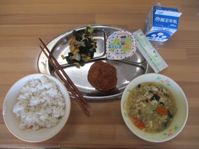 「地場産物活用献立」の日です。メニューは、麦ごはん、県産味噌カツ、わかめサラダ、川俣しゃもボールスープ、県産ブルーベリーゼリーでした。